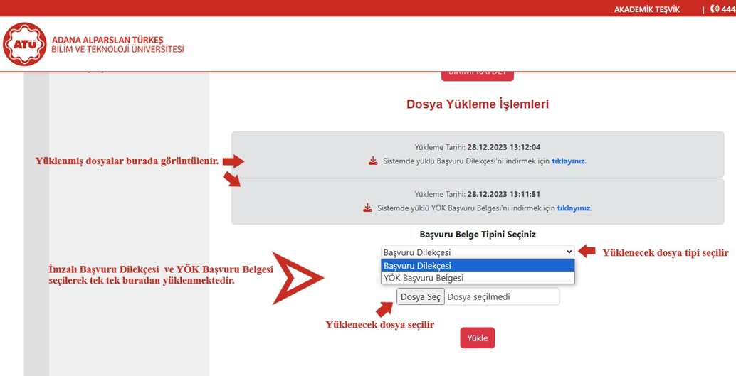 Başvuru Dilekçesi ve YÖK Başvuru Belgesi “Ayarlar & Dosya İşlemleri” menüsündeki ekrandan yüklenmektedir. Ayrıca yüklenmiş dosyalar da görüntülenebilmektedir.
