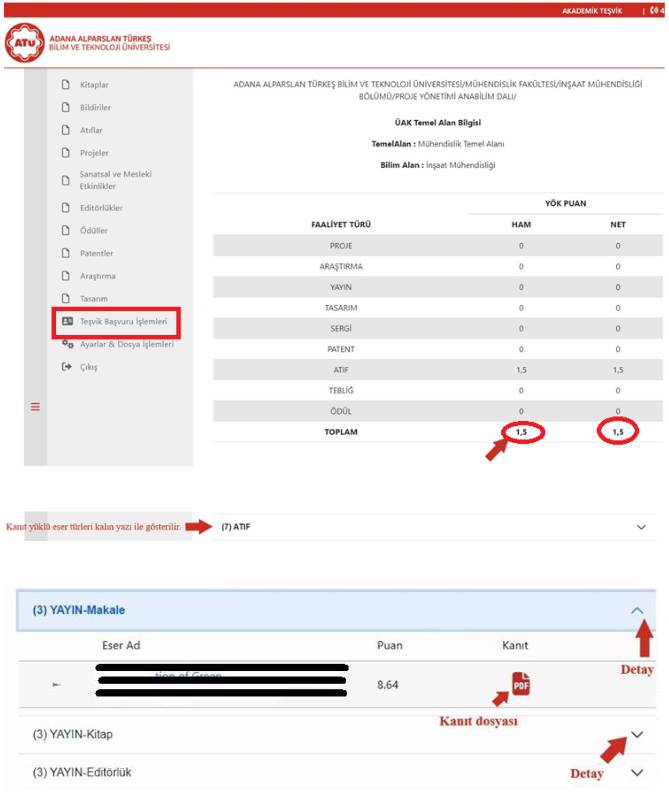 “Teşvik Başvuru İşlemleri” sekmesinden başvuru işlemleri yapılmaktadır. Başvuru ekranında beyan edilen ham ve net puan ile komisyona gönderilecek eserlere ait kanıtlar ve ayrıntılar görülmektedir.