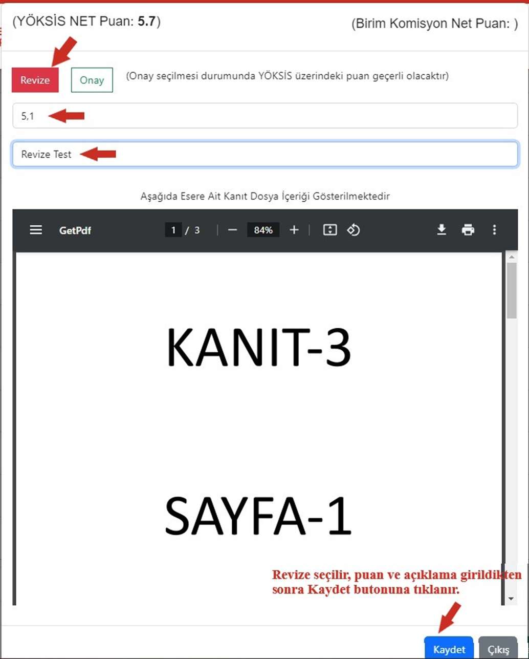 Revize işlemi durumunda “Revize” butonu seçilir. Komisyon puanı ve revize açıklaması girilir.